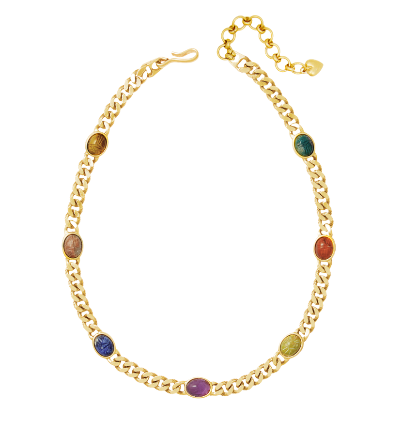 • Oval gemstone carved scarab cabochons set on gold plated curb chain