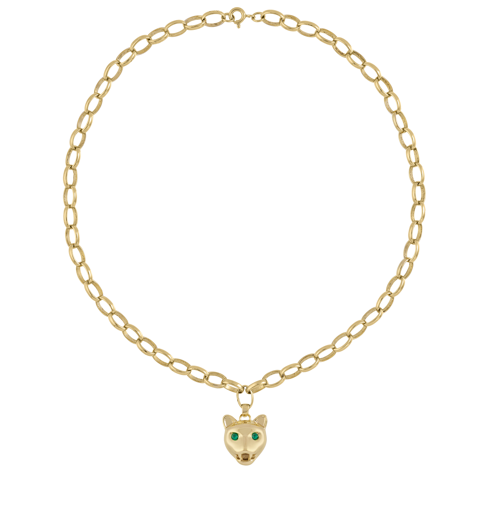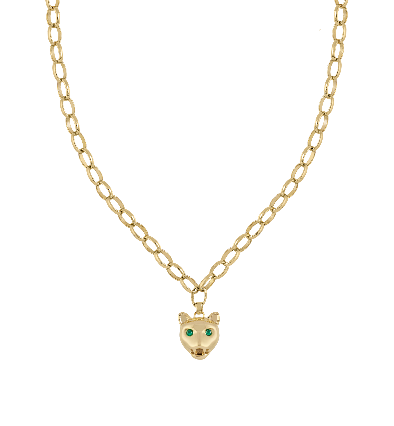 The Show Cat Necklace has a chunky link chain and a leopard charm in the middle. The leopard has zirconia gemstones inlaid as eyes. Pair it with the Show Cat Bracelet for a unique look.