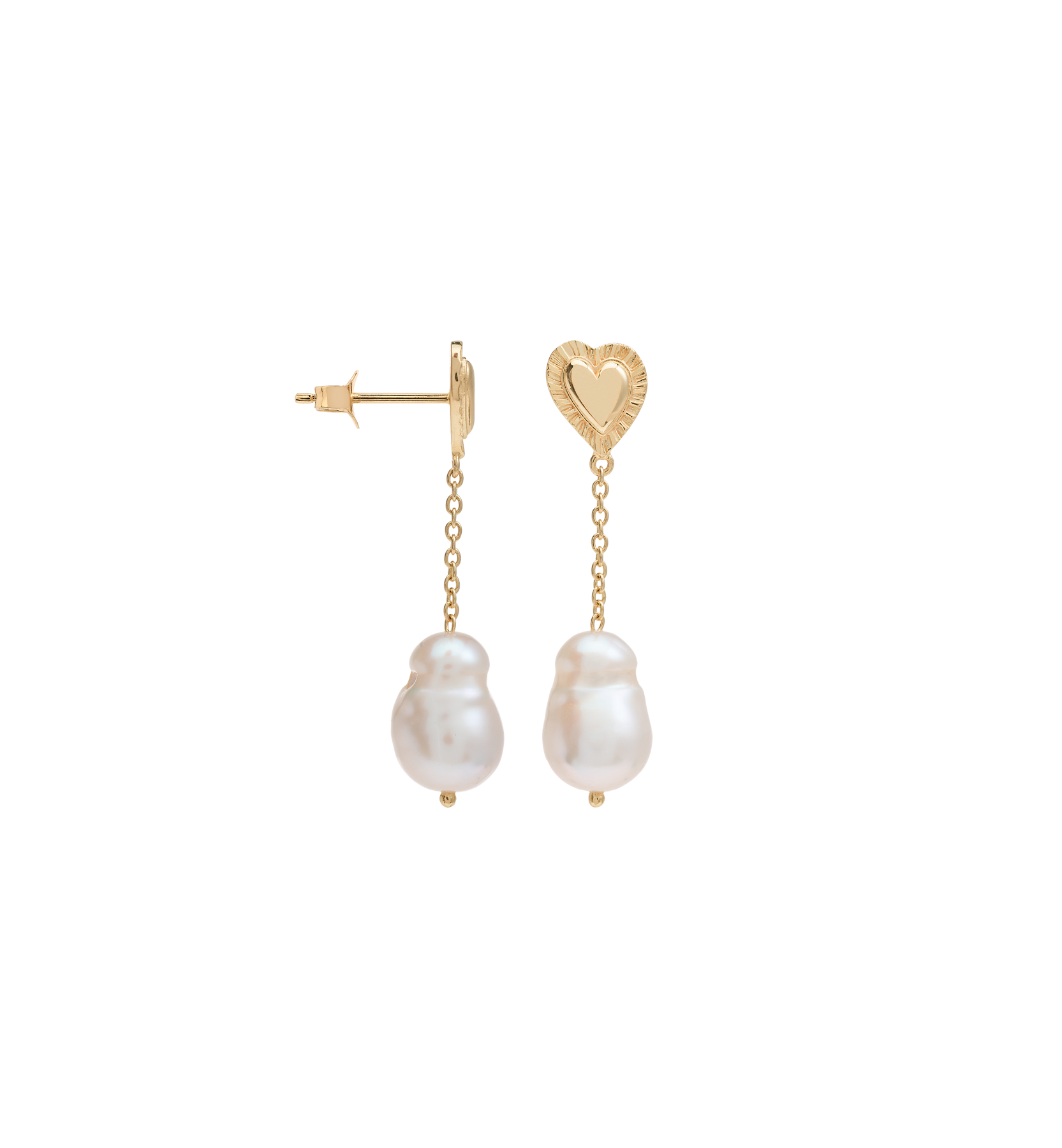 The Single My Heart Dropped Stud 14K is a unique piece. The earring is shaped like a heart with a pearl hanging from the chain. This eye-catcher completes any outfit.