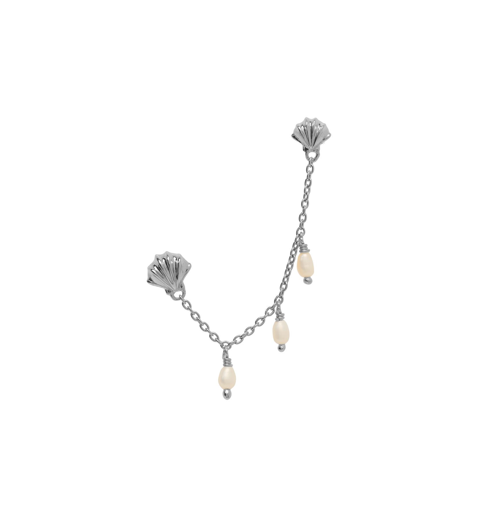 The Single Ocean’s Opulence Chain Stud features a unique design. The two studs, shaped like seashells, are connected by a chain adorned with pearl droplets. Combine this with other items from the collection for the perfect match.