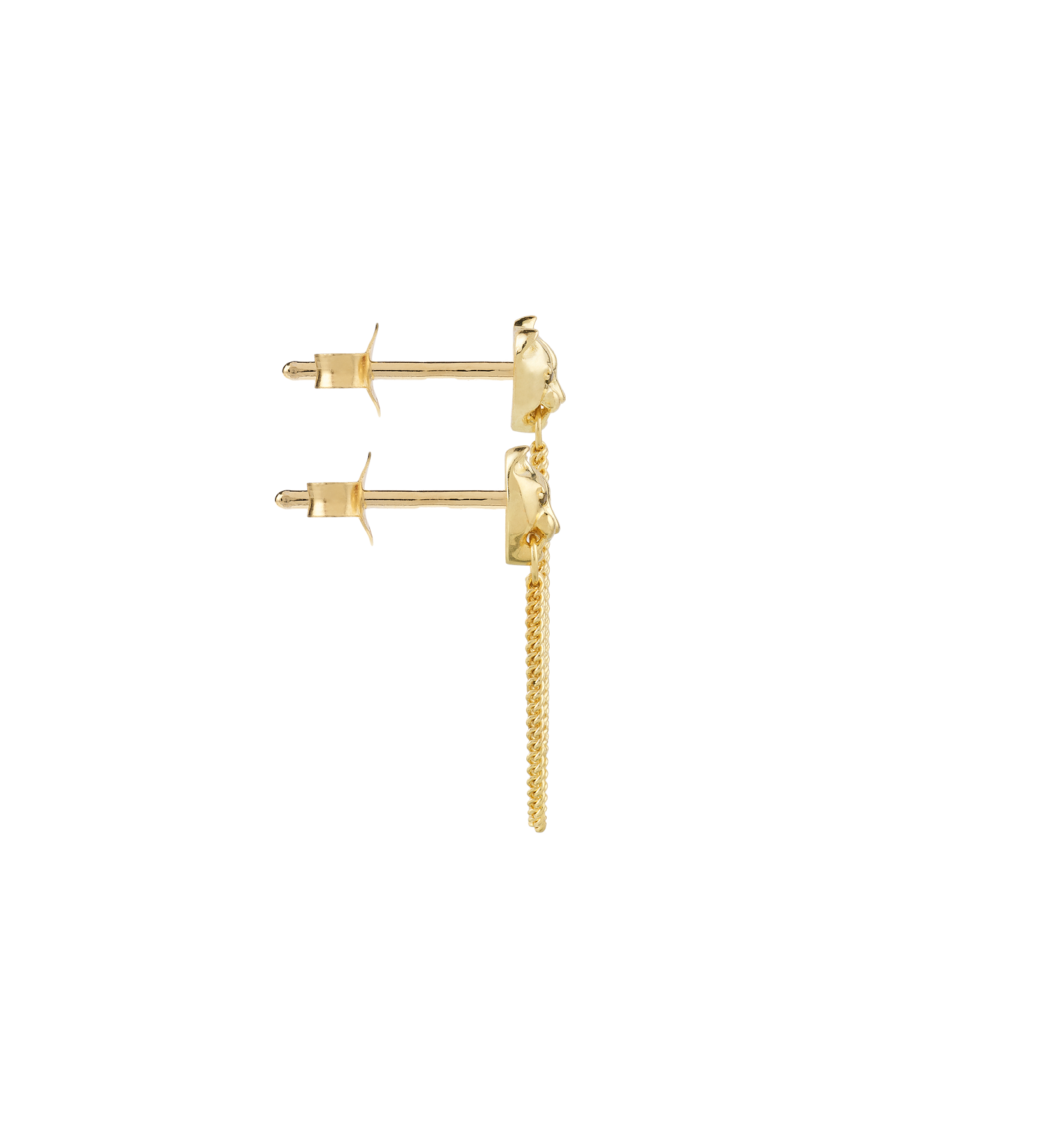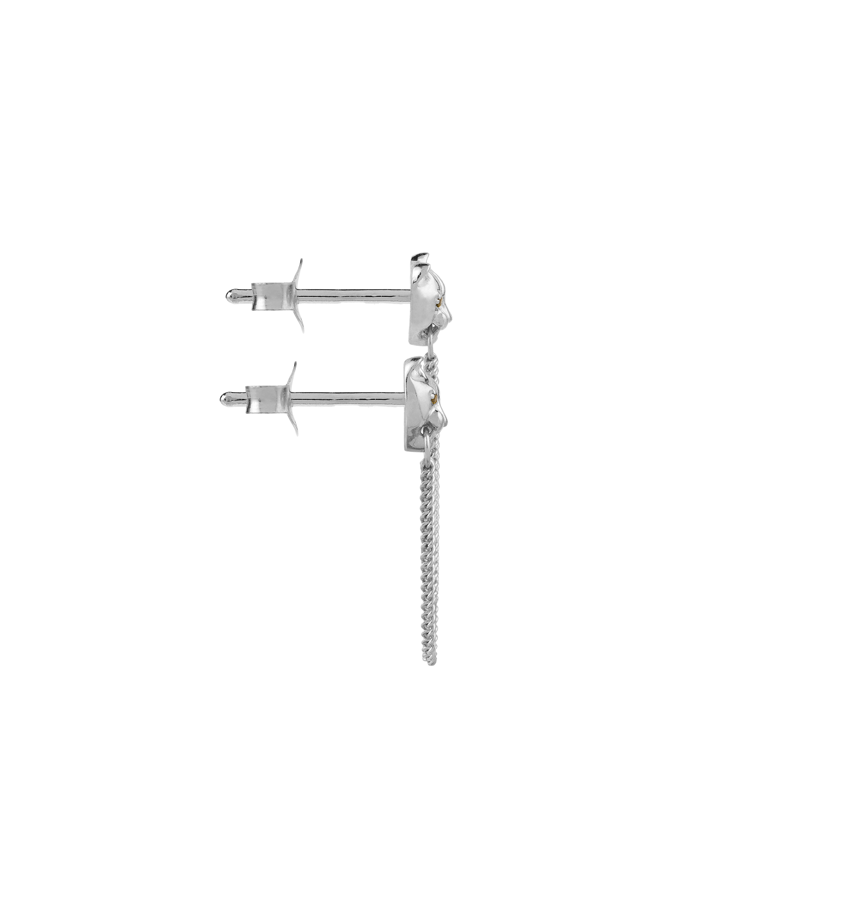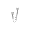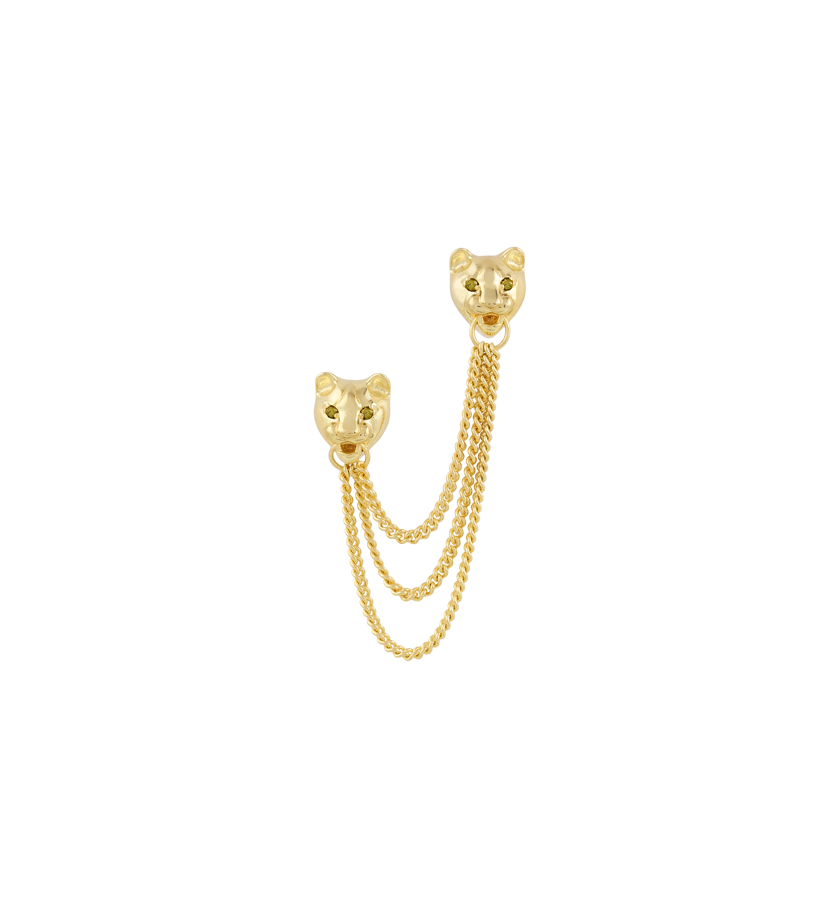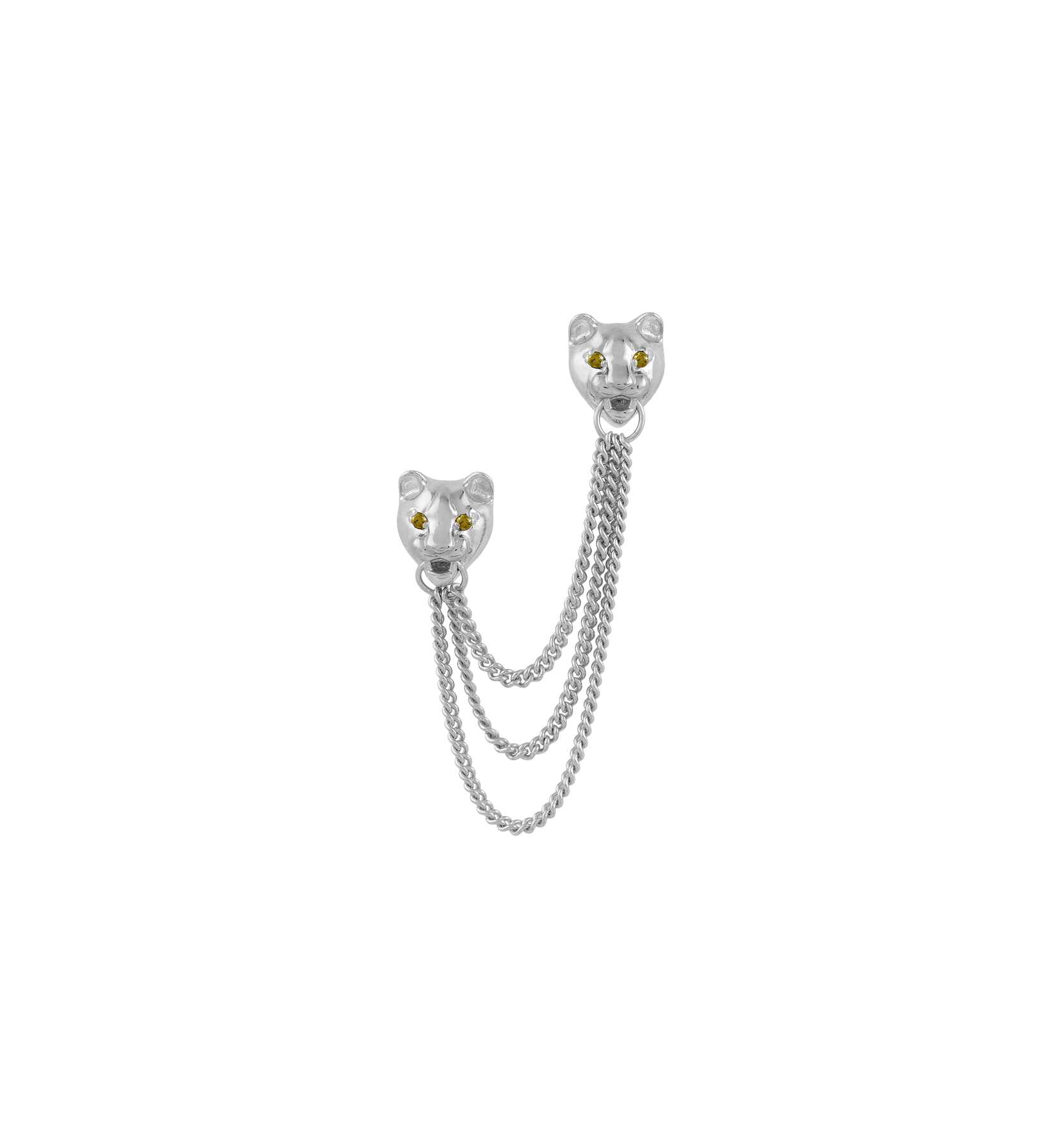 The Single Show Cat Chain Stud is a real eye-catcher. This item features a double stud with a leopard design with zirconia gemstones as eyes. The chains of the stud run between the mouths of the leopards. This stud is perfect for any jewellery lover.